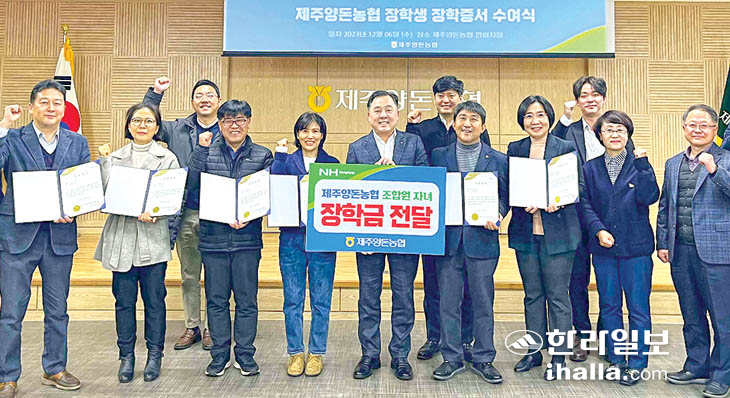 제주양돈농협(조합장 고권진)은 지난 6일 제주양돈농협 한림지점 대회의실에서 '조합원 자녀 장학금 전달식'을 개최했다. 제주양돈농협은 매년 대학에 재학 중인 조합원 자녀를 대상으로 1인 최대 200만 원의 장학금을 지급하고 있다. 2023년 조합원 자녀 장학금 대상에는 13명의 조합원 자녀가 선발돼 총 2317만여원 지급됐다.