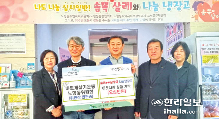 바르게살기운동노형동위원회(위원장 변관종)는 7일 제주시 노형동주민센터(동장 김신엽)를 방문해 어려운 이웃에게 먹거리 기부 후원을 위해 운영 중인 '솜뽁 ♥♥ 살레와 나눔 냉장고'에 50만원 상당의 식자재를 전달했다.