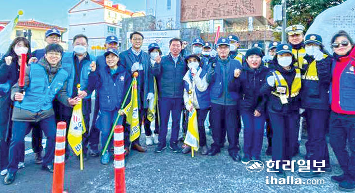 제주시 바르게살기운동아라동위원회(위원장 김정심)는 지난 4일 회원 10여 명이 참여한 가운데 아라초등학교 앞 횡단보도 일대에서 보행 시 휴대전화 안 보기 올바른 보행과 차량 서행 안전운전 등 어린이 등굣길 교통안전 캠페인 활동을 전개했다.
