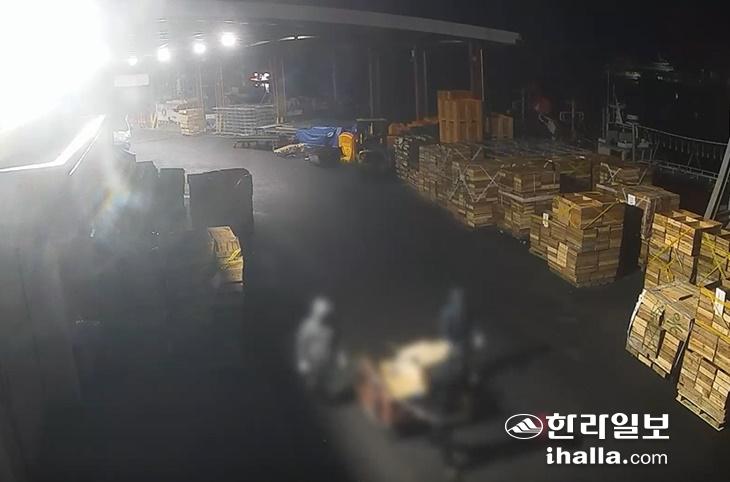 외국인 선원들이 훔친 냉동 갈치를 운반하는 모습. 서귀포해경 제공