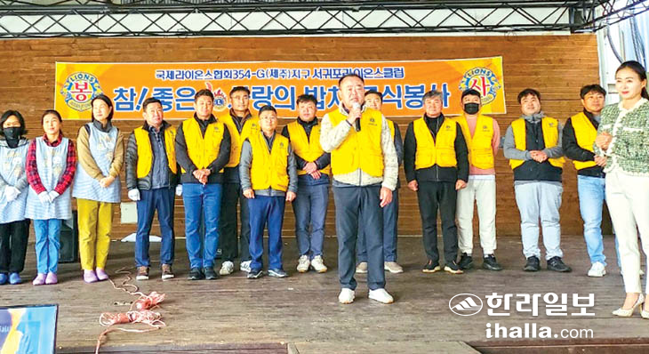 서귀포라이온스클럽(회장 김대윤) 라이온과 부인회원들은 지난 19일 서귀포매일올레시장 야외 공연장에서 서귀포시 자원봉사센터와 함께 취약계층 등 290명에게 '사랑의 밥차' 무료 급식 봉사를 실시했다.