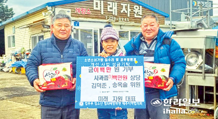 법무부 청소년 범죄예방위원 제주지역협의회(회장 고영두) 소속 김덕준(청소년분과 동부지구)·송옥술(자원봉사분과 동부지구, 미래자원 대표) 위원은 지난 19일 도내 소년원과 함덕아가의집 등에 소년소녀 가장을 위한 성금 200만원과 사과즙 200만원 상당을 기부했다.
