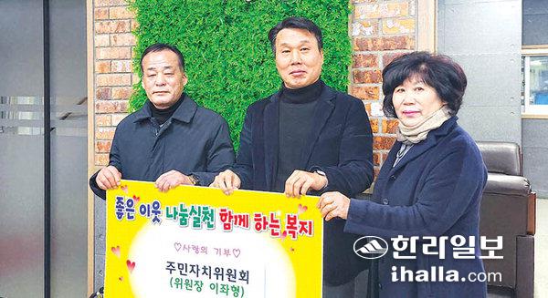 서귀포시 대천동주민자치위원회(위원장 이좌형)는 지난 8일 대천동주민센터(동장 정창용)를 방문해 '2023년 초록농장 가꾸기 사업'으로 수확한 고구마 판매 수익금 100만원을 대천동 관내 어려운 이웃을 위해 사용해 달라며 기탁했다.