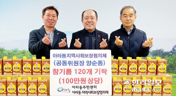제주시 아라동지역사회보장협의체(공동위원장 양순종)는 9일 참기름 120개(100만원 상당)를 아라천사1004곳간에 기탁했다.