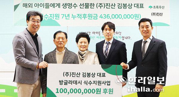 제주시 화북2동에 위치한 주식회사 진산 대표이자 초록우산 그린노블클럽 회원인 김봉상 대표는 지난 8일 초록우산 제주지역본부(본부장 변정근)에 '해외 저개발국가 식수지원 사업'을 위한 기금 1억원을 전달했다.
