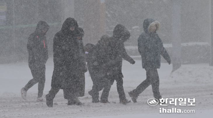 많은 눈이 내린 23일 오전 제주시 아라동에서 시민들이 얼어붙은 도로 위를 조심히 걷고 있다. 이상국기자