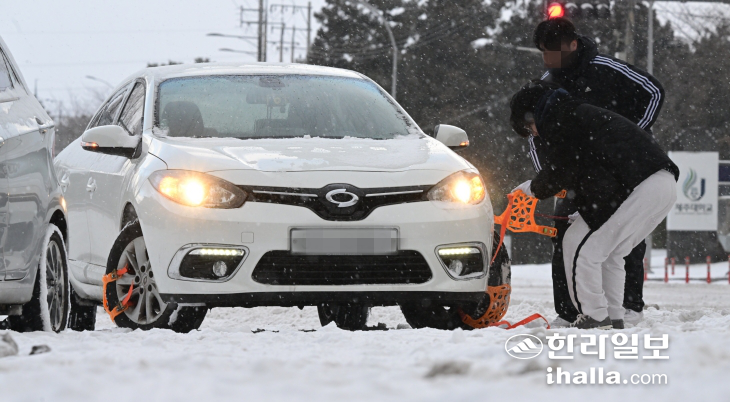 23일 제주대학교 사거리 인근에서 한 운전자가 차량을 멈추고 바퀴에 체인을 감고 있다. 이상국기자
