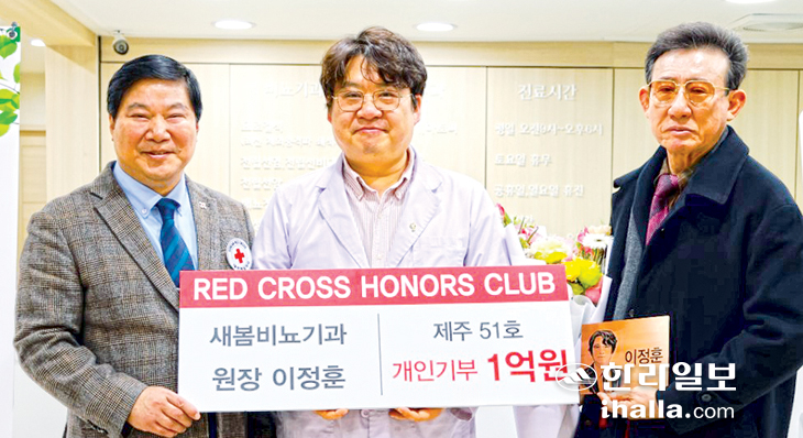 제주시 일도이동 소재 새봄비뇨기과 이정훈 원장은 지난 23일 대학적십자사 제주도지사(회장 정태근)에서 실시하는 1억원 이상 고액기부자 모임인 레드크로스아너스클럽(Red Cross Honors Club)에 제주 51호로 가입했다.