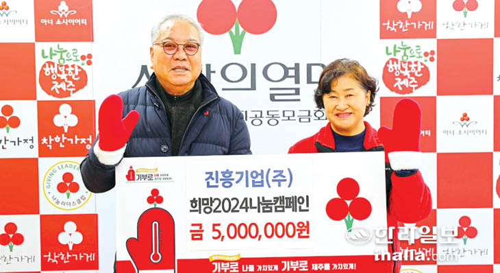 (주)진흥기업(회장 이철수·대표이사 이태훈)은 지난 23일 제주사회복지공동모금회(회장 강지언) 사무실에서 희망2024나눔캠페인 이웃사랑 성금 500만원을 기탁했다.