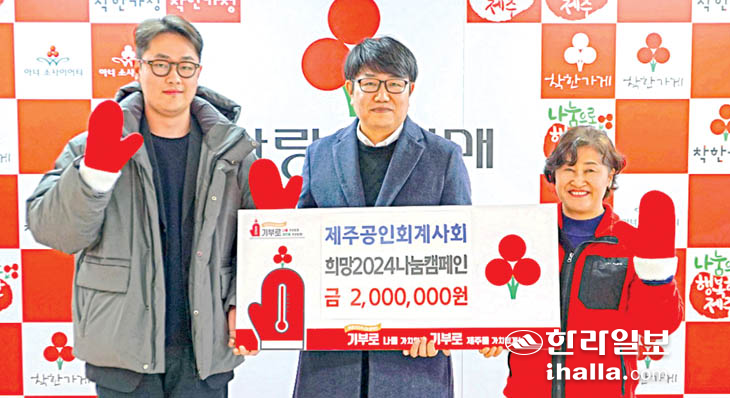제주공인회계사회(회장 고영민)는 지난 23일 제주사회복지공동모금회(회장 강지언) 사무실에서 희망2024나눔캠페인 성금 200만원을 기탁했다.