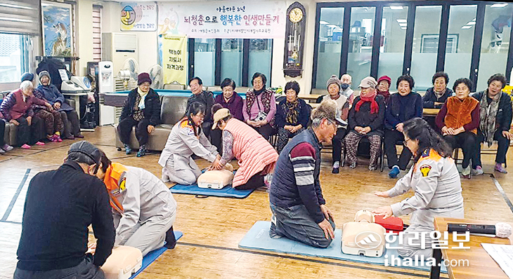 제주시 하귀여성의용소방대(대장 김형숙)는 지난 24일 하귀1리경로당에서 40여 명의 어르신들을 대상으로 의용소방대원들이 강사로 참여해 찾아가는 응급처치 교육을 실시했다.