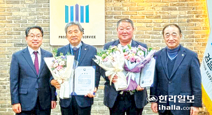 법무부 청소년 범죄예방위원 제주지역협의회(회장 고영두)는 지난 24일 제주지방검찰청 소회의실에서 노만석 검사장 및 검찰 간부, 범죄예방위원 회장단 등 20여 명이 참석한 가운데 청소년 선도 봉사활동에 기여한 공로로 정승익(청소년분과 서부지구) 위원, 김덕준(청소년분과 동부지구) 위원에 대한 법무부장관 표창패를 수여했다.