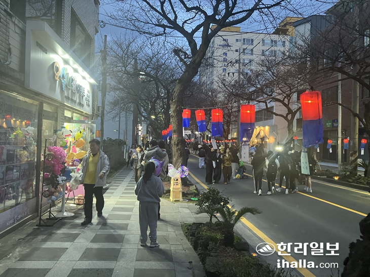22일 제주시 전농로 일대. 길 가장자리를 따라 쭉 심어진 벚꽃나무에는 꽃봉오리만 살짝 맺혀있었다. 벚꽃이 일찍 개화한 나무도 있었지만, 대부분 겨울나무처럼 휑했다. 여느 때처럼 분홍빛 벚꽃이 반겨주지는 않았지만 가게마다 크게 울려펴지는 노랫소리는 축제 분위기를 자아냈다. 해가 지면서 나무를 쭉 따라 걸린 청차초롱 불빛이 하나둘씩 켜지자 사람들은 감탄을 자아냈다. 도민과 관광객들은 청사초롱을 배경으로 사진을 찍으며 추억을 남기기도 했다. 또 행사 부스 주변에는 각종 먹을거리를 즐기는 사람들과, 마련된 무대공연을 즐기는 사람들로 발 디딜 틈 없었다.