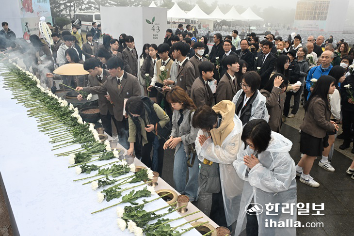 | 3일 제주시 봉개동에 위치한 제주4·3 평화공원에서 봉행된 제76주년 4·3 희생자 추념식에서 참석자들이 헌화하고 있다. 제주도사진기자회 |