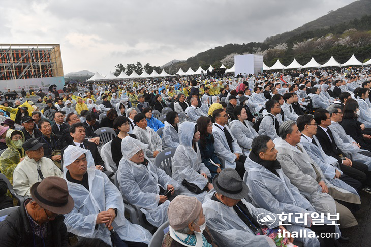 | 비가 내린 3일 제주시 봉개동에 위치한 제주4·3 평화공원에서 제76주년 4·3 희생자 추념식이 열리고 있다. 제주도사진기자회 |