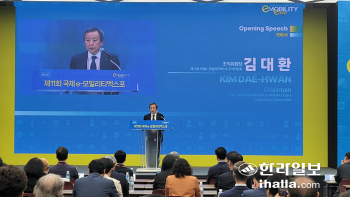 | 30일 서귀포 제주국제컨벤션센터에서 막을 올린 제11회 국제e-모빌리티엑스포에서 개회사하는 김대환 조직위원장. |