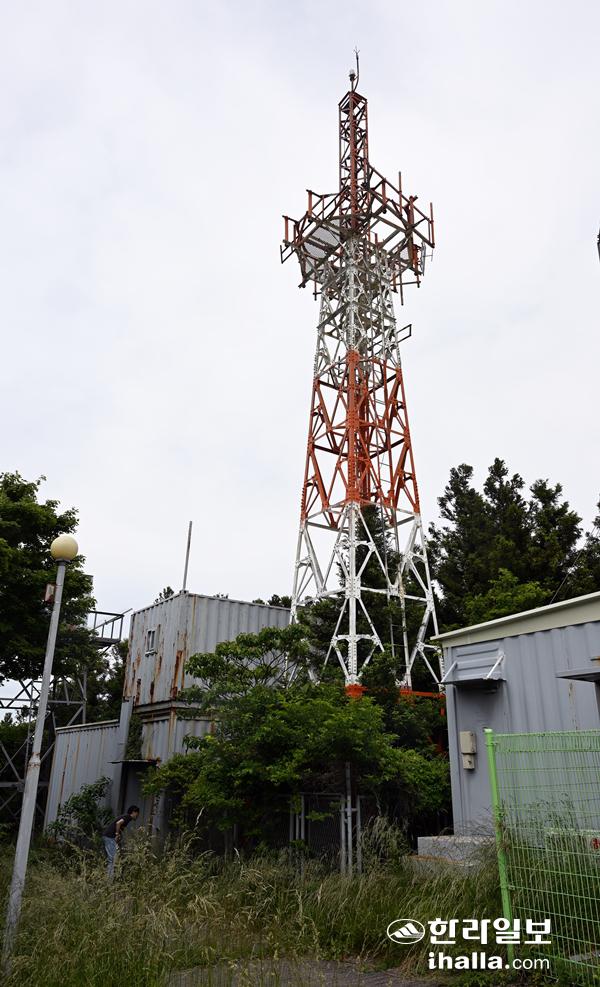 | 개오리오름에 설치된 방송, 통신 목적의 무선기지국들. 사진에서 맨 왼쪽에 있는 철탑 모양의 무선기지국이 6년째 오름 중턱을 무단 점유한 시설물로 조만간 강제 철거된다. 강희만 기자 |
