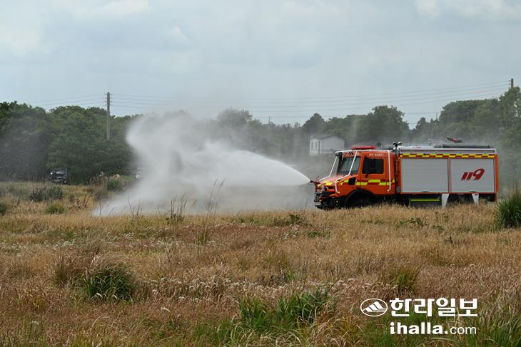 제주소방안전본부는 4일 서귀포시 표선면 영주산 일대에서 험지펌프차 시연회를 열었다.