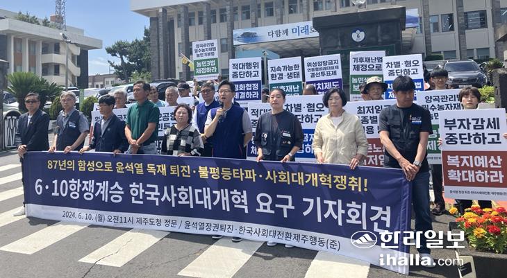 윤석열정권퇴진·한국사회대전환 준비위원회는 10일 제주도청 앞에서 기자회견을 열고 "오늘 우리는 한국사회대개혁을 위한 당면 10대 요구를 걸고, 불평등과 기후위기 시대, 한국사회 대전환을 위해 함께 연대하고 투쟁할 것을 결의한다"고 밝혔다.