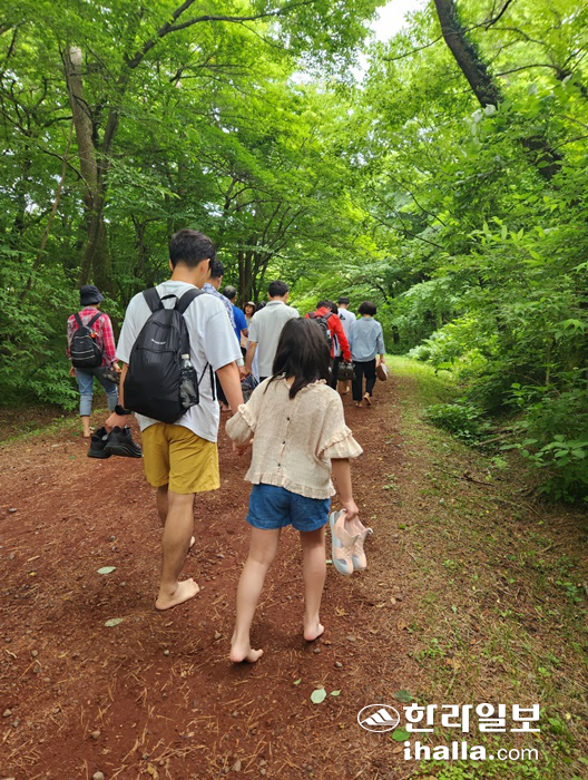 [한라일보] "차가워서 기분이 좋아요." 맨발로 숲길을 디딘 한 초등학생의 첫마디였다. 할머니, 어머니와 함께 숲길을 찾은 아이는 숲을 가로지르는 다람쥐의 모습에 마냥 기뻐하더니 맨발 걷기도 가뿐하게 해냈다.