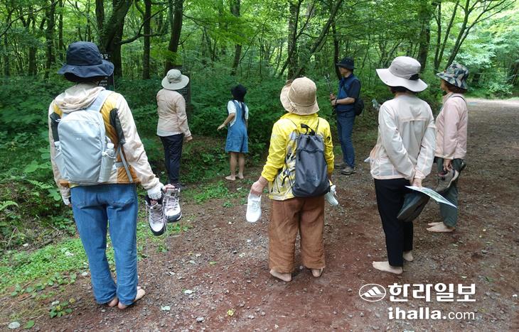 지난 16일 사려니숲 비자림로 입구 방면에서 숲길 맨발 걷기 체험이 이뤄지고 있다. 진선희기자