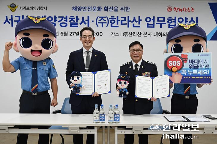 [한라일보] 서귀포해양경찰서(서장 고성림)는 27일 제주의 대표적인 소주 회사인 (주)한라산(대표 현재웅)과 해양 안전 문화 확산 상호 협력을 위한 업무 협약을 체결했다.