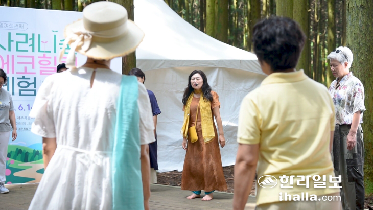 | 올해 사려니숲 에코힐링 체험행사에서 '생태춤 명상' 프로그램을 진행 중인 경희 씨. 사진=신비비안나 기자 |