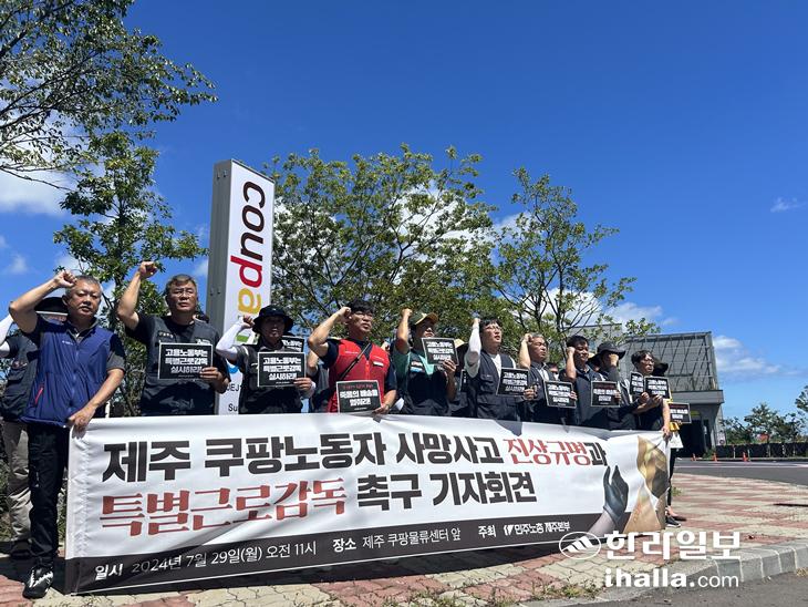 민주노총 제주본부는 29일 제주시 애월읍 쿠팡물류센터 앞에서 '제주 쿠팡노동자 사망사고 진상규명과 특별근로감독 촉구 기자회견'을 열었다.