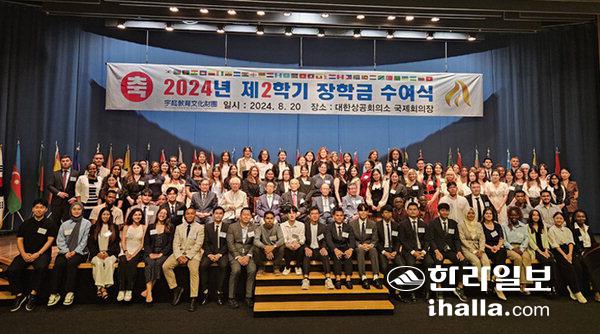 [한라일보] 부영그룹의 우정교육문화재단(이사장 이중근)이 20일 대한상공회의소에서 '2024년 2학기 외국인 유학생 장학금 수여식'을 갖고 국내 대학에 재학 중인 33개국의 외국인 유학생 99명에게 장학금 4억200만원을 기부했다.