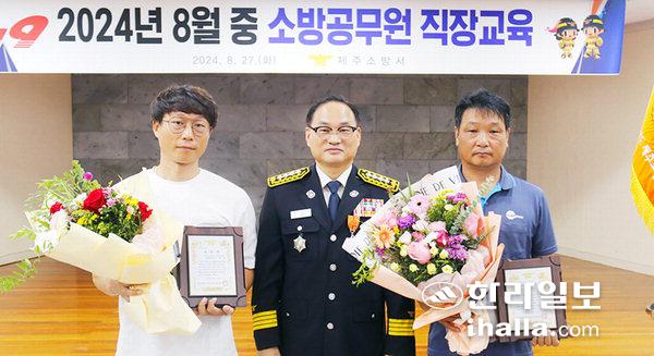 [한라일보] 제주소방서(서장 양영석)는 지난 27일 제주소방서 대회의실에서 공동주택 화재를 초기 진압해 확대를 막은 고종우(54)씨와 고혁준(42)씨에게 표창장을 수여했다.