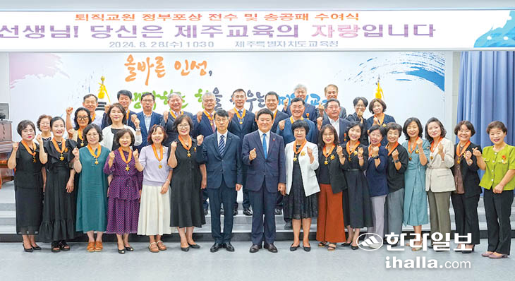 제주특별자치도교육청은 28일 2024년 8월 말 퇴직교원 정부포상 대상자 107명에 대한 전수 및 송공패 수여식을 도교육청 본관 4층 대회의실에서 개최했다.