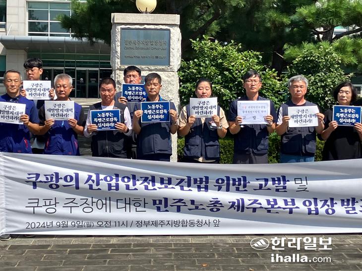 민주노총 제주본부는 9일 정부제주지방합동청사 앞에서 기자회견을 열고 "고용노동부는 쿠팡에 대한 철저한 조사와 특별감독을 통해 노동자의 죽음을 막아야 한다"고 주장했다.