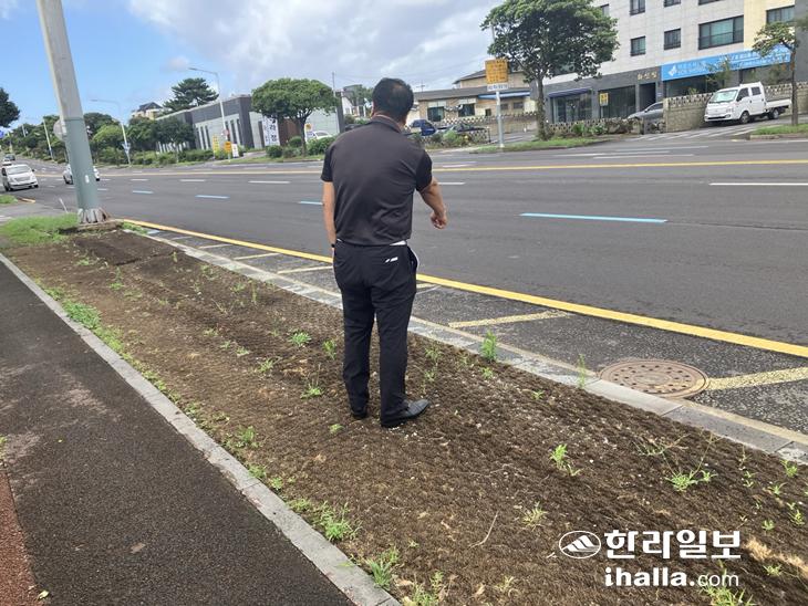 주민 A씨는 "2022년 공사가 진행될 당시 안내문 하나만 달랑 설치됐다"면서 "공사가 멈춘 이후에도 무슨 이유에서 공사가 멈췄는지, 언제 다시 이뤄질 건지 그 아무것도 주민들에게 설명을 해주지 않았다"고 말했다. 이어 "사업 과정에서 파헤쳐진 식수대는 그대로 방치됐고, 민원이 제기되자 그 위로 야자수 매트를 깔았다"면서 "그렇게 약 2년 동안 보행자들은 매트 위를 지나다녀야 했다. 지금은 그 사이로 잡초가 올라오며 미관도 상당히 저해하고 있다"고 불평했다.