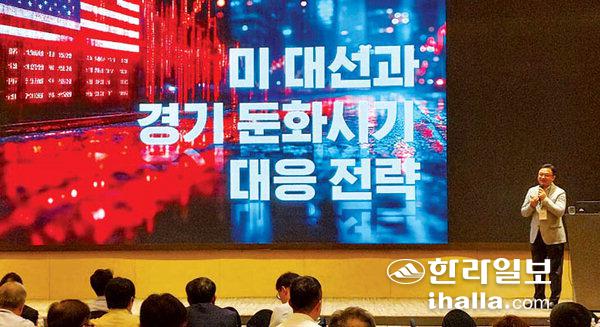 도내 주요 기업체와 유관기관장 등 150여 명이 참석한 이날 포럼에서는 서상영 미래에셋증권 리서치센터 상무가 '미국 대선과 경기 둔화시기 대응전략'을 주제로 강연했다.