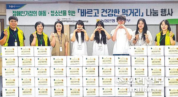 [한라일보] NH농협은행 대학생봉사단 'N돌핀'은 지난 20일 제주도장애인종합복지관에서 장애인가정 아동·청소년을 위한 '바르고 건강한 먹거리 꾸러미' 포장봉사를 했다.