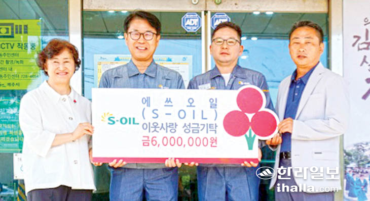 S-오일 제주저유소(소장 곽재호)는 지난 6일 제주시 건입동주민센터에서 이웃사랑 성금 600만원을 제주사회복지공동모금회(회장 강지언)에 기탁했다. 성금은 건입동 지역 내 복지사각지대 발굴 및 해소에 사용될 예정이다.