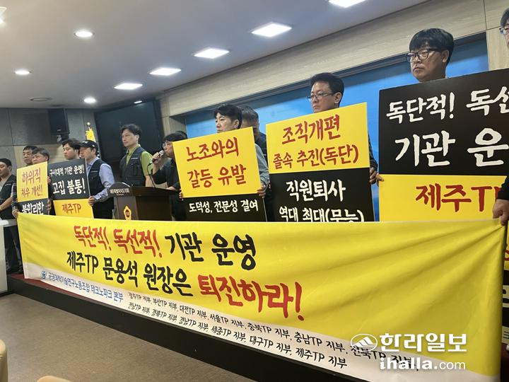 공공과학기술연구노동조합 제주테크노파크지부(이하 지부)는 15일 제주도의회 도민카페에서 기자회견을 열고 "제주테크노파크 문용석 원장은 더 이상 기관장 자격이 없다"며 "독선·독단적 기관 운영을 책임지고 즉각 물러나라"고 촉구했다.
