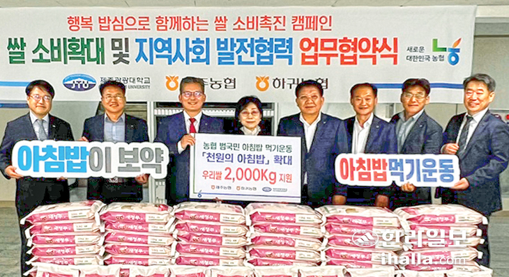농협중앙회 제주본부(본부장 윤재춘)와 하귀농협(조합장 강병진), 제주관광대학교(총장 김성규)는 지난 25일 제주관광대학교 본관에서 범국민 아침밥먹기 운동과 천원의 아침밥 확대, 지역사회 발전을 위한 업무협약을 체결했다.