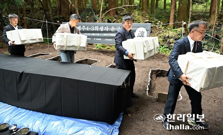 31일 제주시 애월읍 봉성리 공초왓 일대에서 4·3희생자 추정 유해 4구에 대한 운구 제례가 진행됐다. 강희만기자