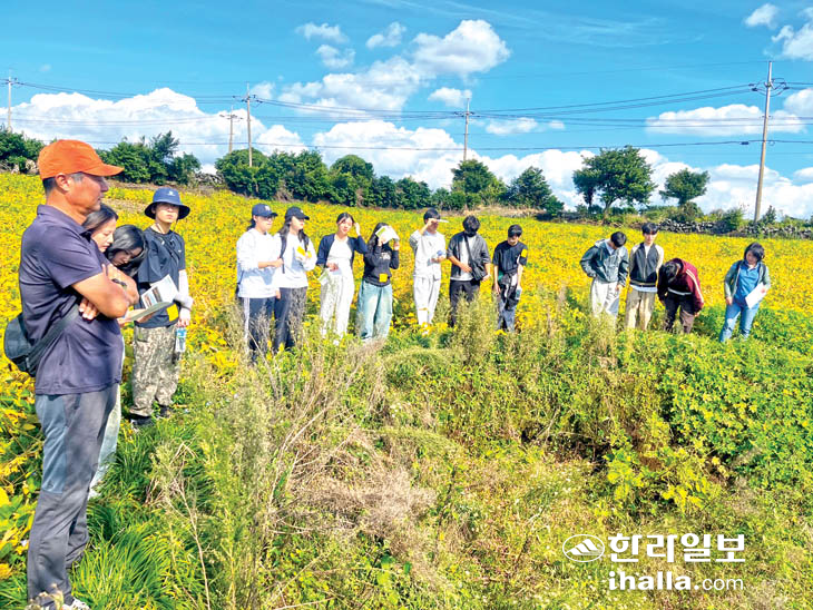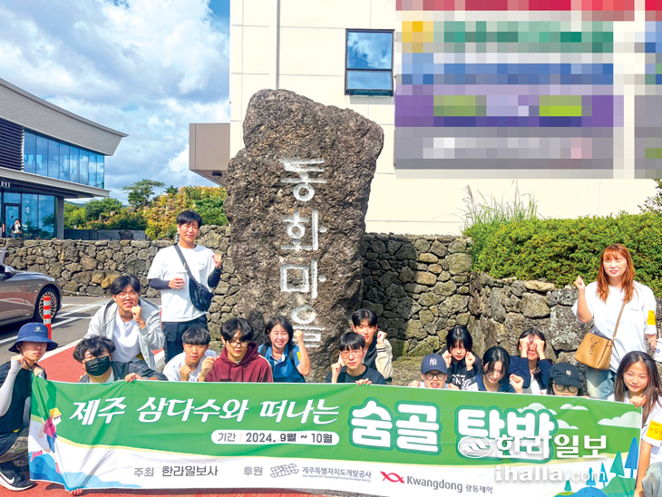 한라일보가 제주개발공사, 광동제약과 공동으로 마련한 '제주삼다수와 떠나는 숨골 탐방'이 지난 13일 제주시 청소년수련관(아라청소년문화의집) 학생 13명을 대상으로 진행됐다. 이날 탐방은 제주시 구좌읍 한동리와 서귀포시 성산읍 온평리 혼인지에 위치한 숨골을 탐방하는 일정으로 이어졌다. 강순석 제주지질연구소장(지질학 박사)이 동행해 숨골에 대해 설명했다.