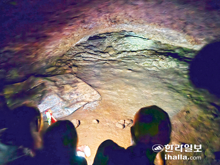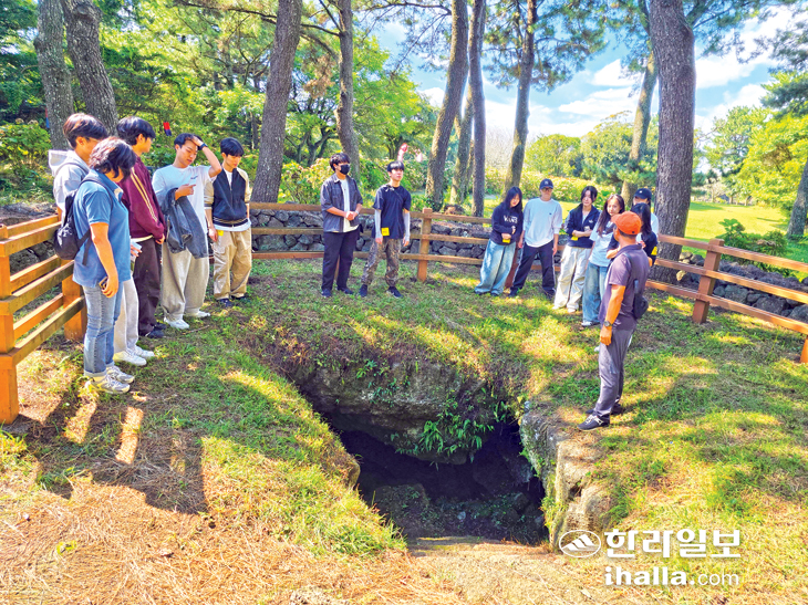 | 서귀포시 성산읍 온평리 혼인지에 위치한 동굴에서 학생들이 강순석 박사의 설명을 듣고 있다. 강다혜기자 |