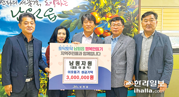 남원자원(대표 이권익)은 지난 5일 성금 300만원을 서귀포시 남원읍(읍장 정창용)에 기탁했다. 남원자원은 이번 성금 기탁만이 아니라 '남원희망나눔캠페인'의 착한가게로 가입해 매월 정기 기부를 실천하고 있다.