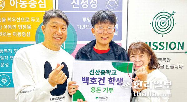 [한라일보] 경북 구미 선산중학교 1학년에 재학 중인 백호건(14)군 가족이 지난 9일 초록우산 제주종합사회복지관을 찾아 50만원을 기부했다.