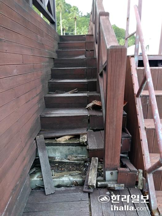 서귀포항 쉼터 목재 계단이 부서진 채 방치되어 있다. 진선희 기자