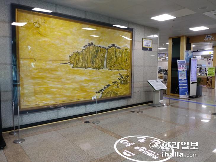 13일 서귀포시에 따르면 '정방폭포'라는 제목이 달린 해당 작품은 1994년 법환동 서귀포시청사(지금의 서귀포시청 제2청사) 신축 기념으로 시공사 측에서 서귀포시에 기증했다. 가로 351㎝, 세로 217㎝에 이르는 500호 크기의 대작이다. 제주특별자치도 출범 이후 두 곳에 분리 운영됐던 시청사가 현재의 서홍동 1청사를 중심으로 재배치되면서 2017년부터 현재의 자리에 전시되고 있다.