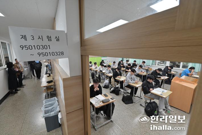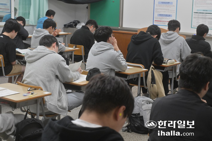 [한라일보] 2025학년도 대학수학능력시험이 치러진 14일 제주 제95지구 제1시험장인 남녕고등학교에서 수험생들이 시험을 앞두고 마지막 정리를 하며 시험 준비를 하고 있다. 제주지역에서는 16개 시험장에서 6900여명이 수능에 응시하며 오후 4시37분에 종료된다. 제주도사진기자회