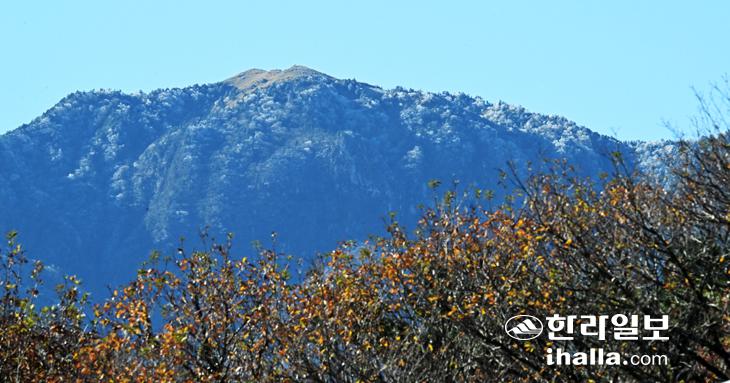 [한라일보] 기온이 뚝 떨어진 18일 관음사 탐방로 주차장에서 바라 본 한라산 정상부가 상고대로 덮여 시선을 사로잡고 있다. 강희만 기자
