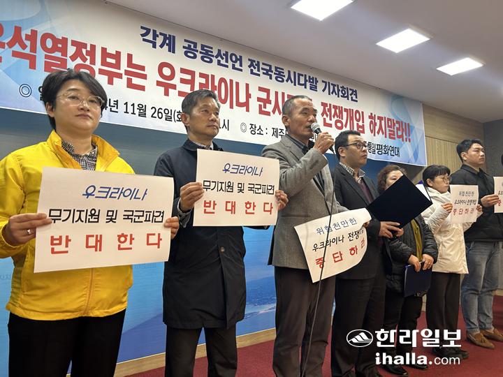 제주자주통일평화연대는 26일 제주도의회 도민카페에서 기자회견을 열고 "우크라이나 전쟁에 대한 정부의 무기지원 및 국군 파견을 반대한다"고 목소리를 높였다.
