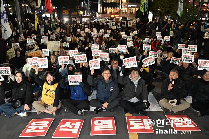 민주노총 제주본부, 진보당 제주도당, 정의당 제주도당 등 도내 21개 정당 및 시민단체 등으로 구성된 윤석열 정권 퇴진·한국사회대전환 제주행동(이하 제주행동)은 4일 오후 제주시청 앞에서 '윤석열 즉각 퇴진요구 제주도민대회'를 열었다.