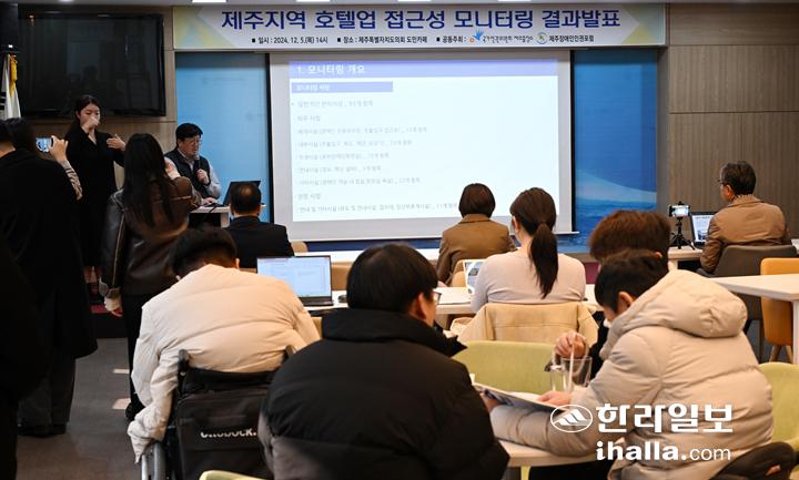 (사)제주장애인인권포럼과 국가인권위원회 제주출장소가 5일 제주도의회 도민카페에서 '제주지역 호텔업 접근성 모니터링 결과'를 발표하고 있다. 강희만기자